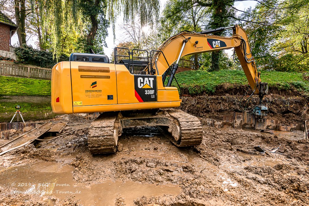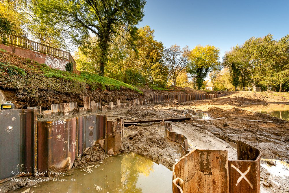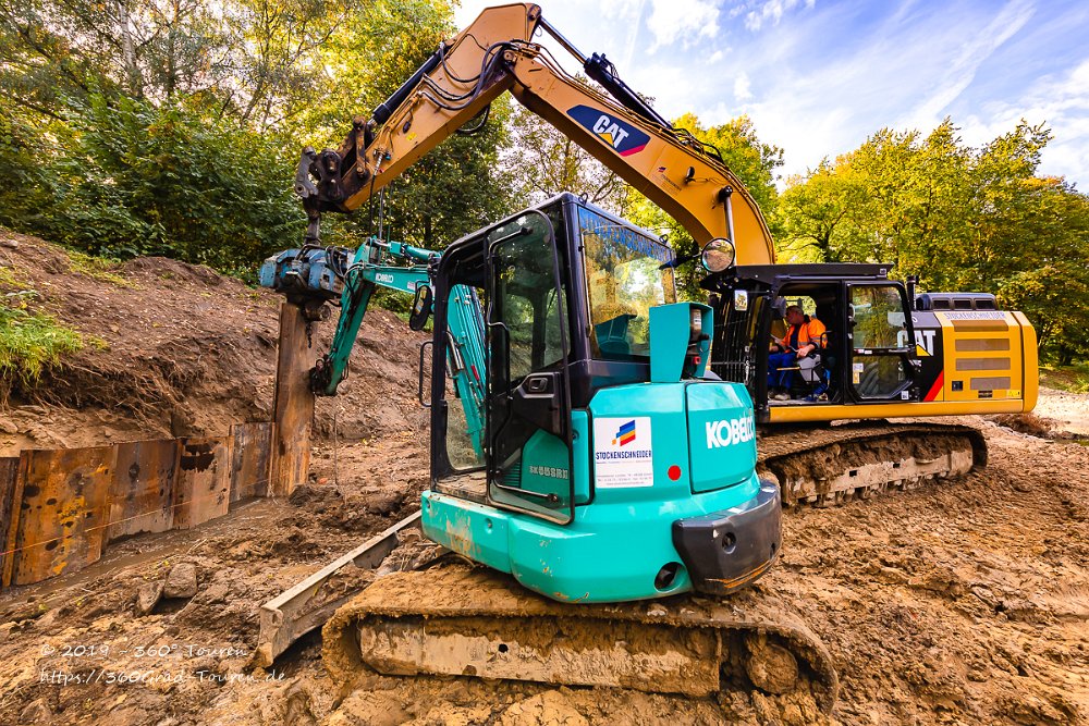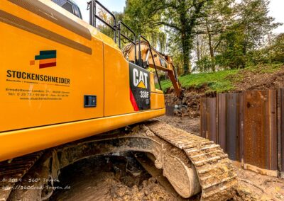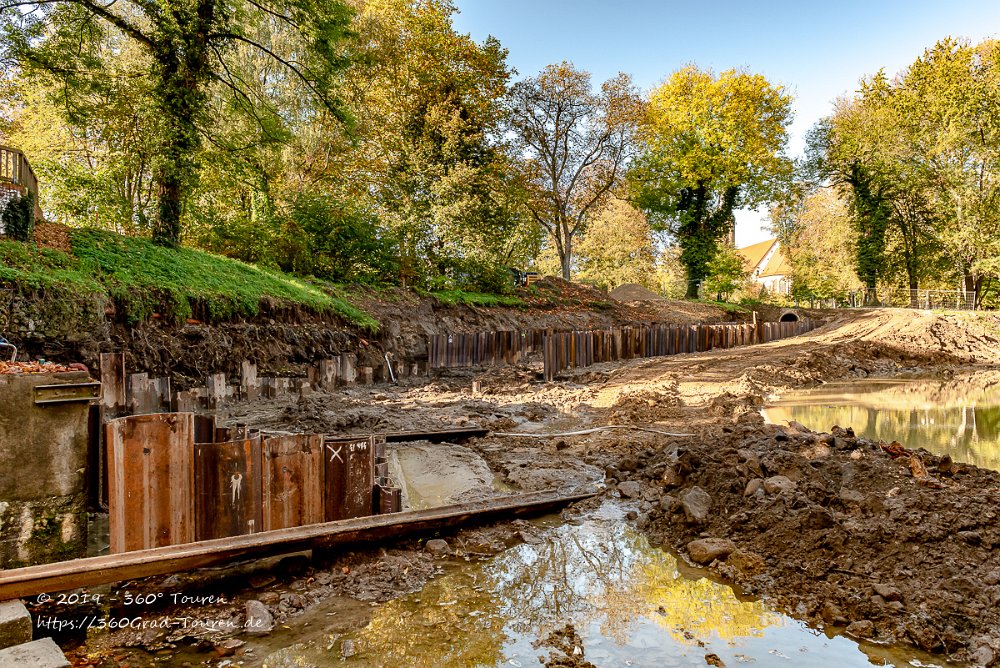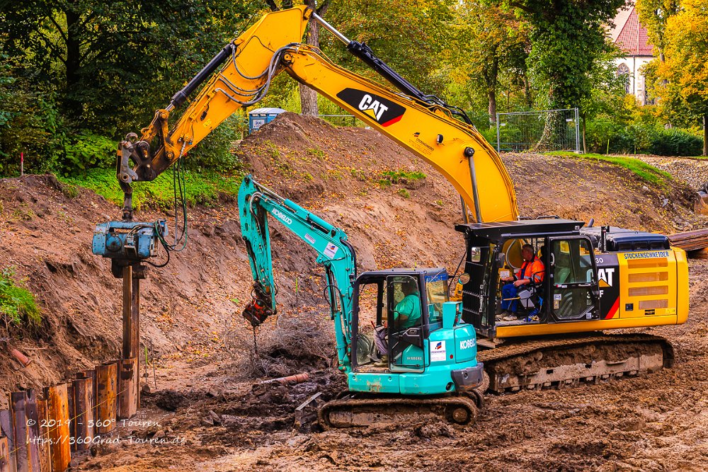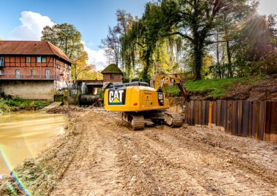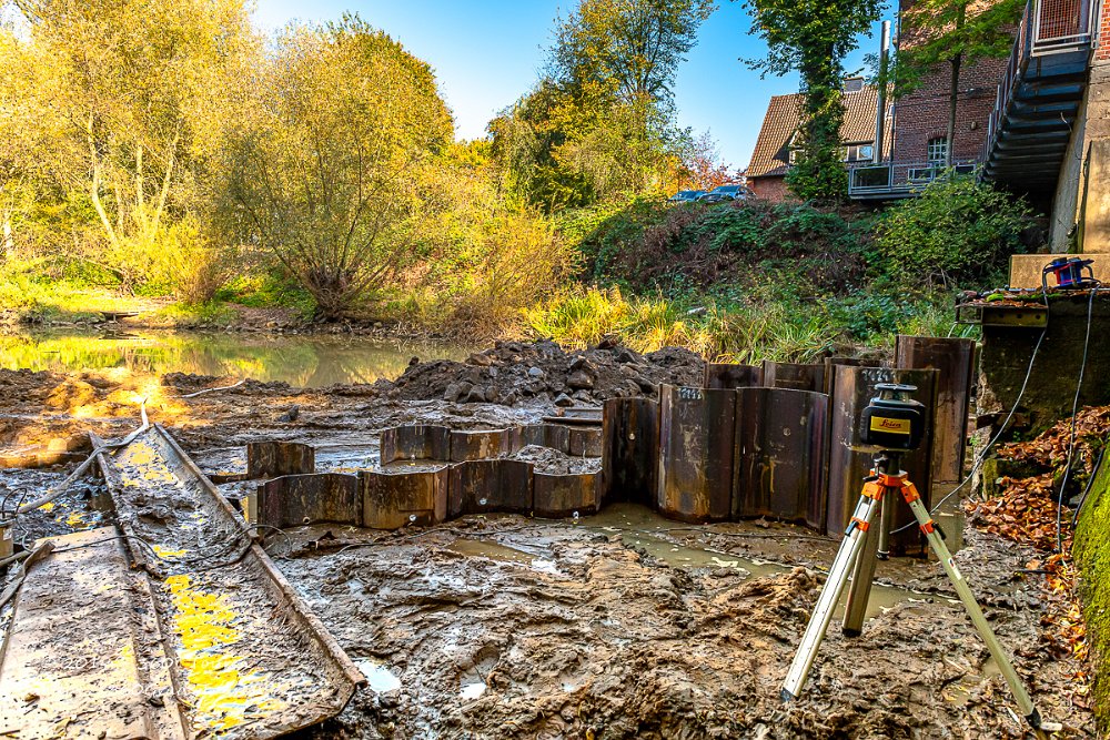Die vorhandene Mergelschicht in ca. 2 m Tiefe erschwerte das Einbringen der Spundbohlen. Die Arbeiten erforderten daher einen erhöhten Aufwand und präzise Messverfahren.
