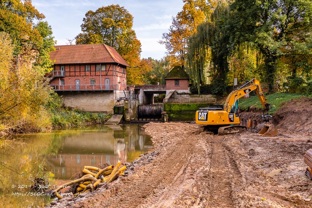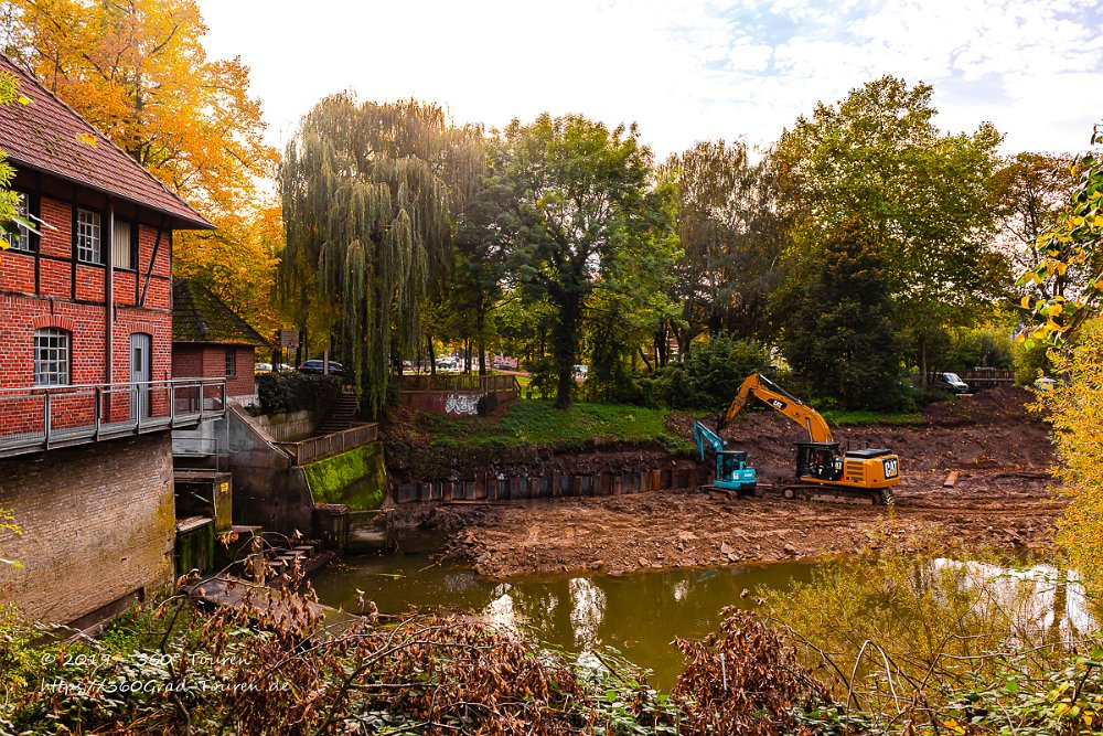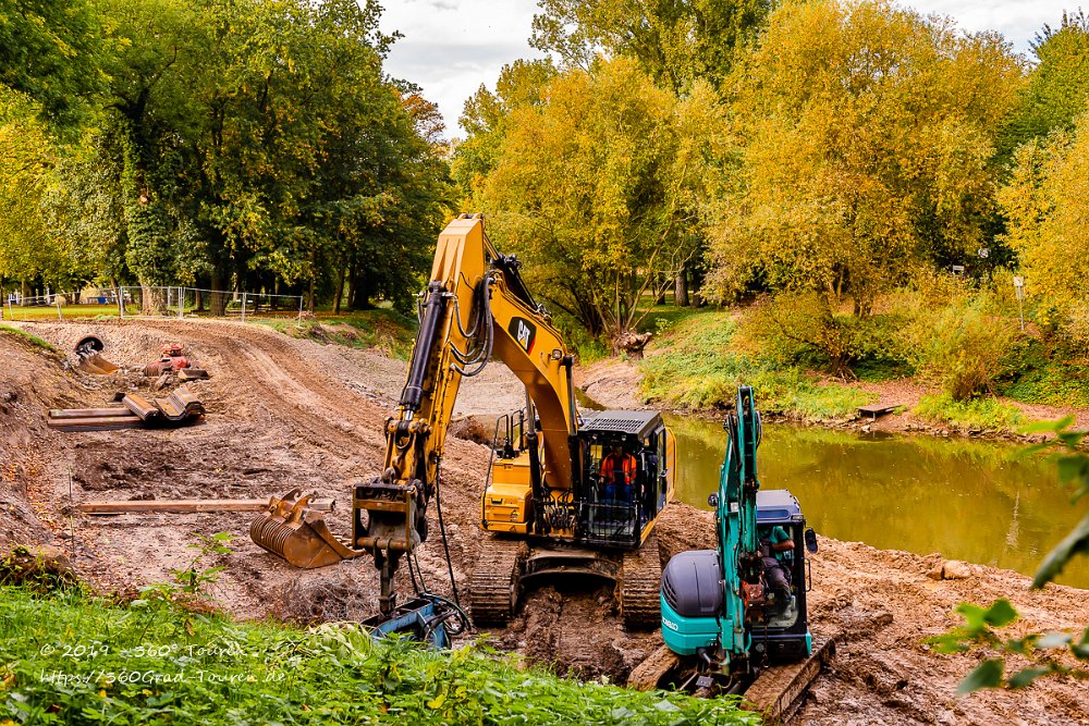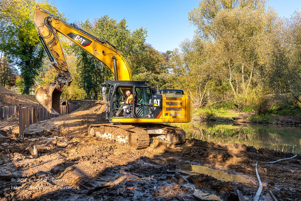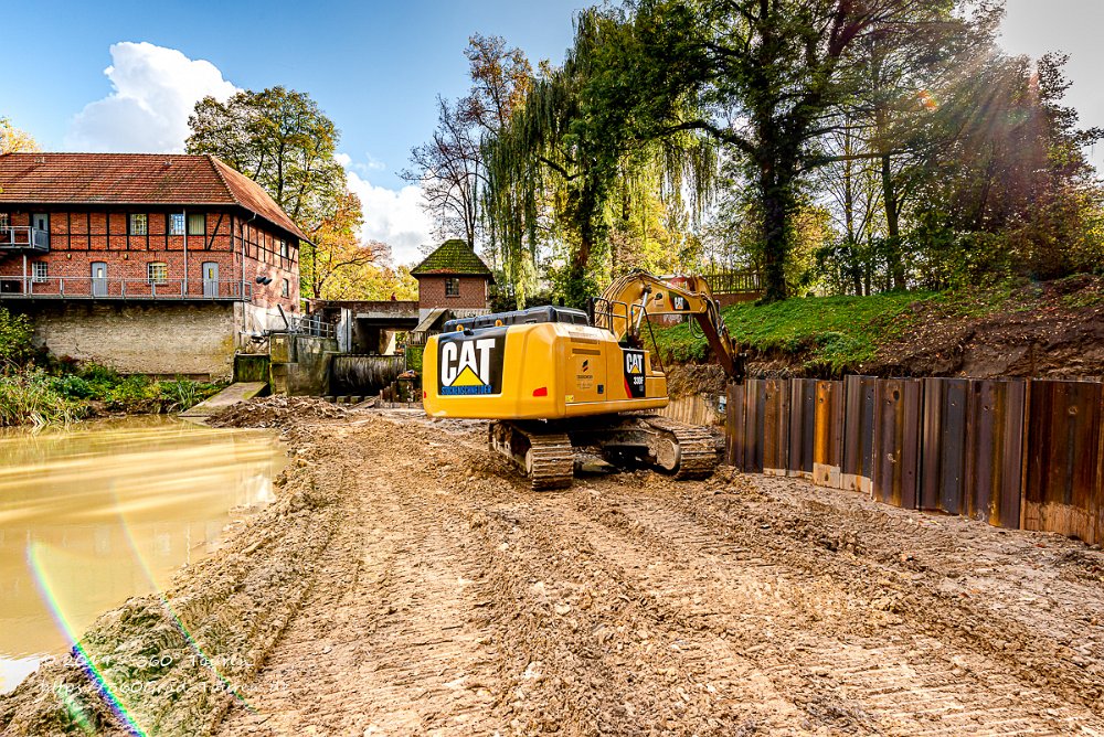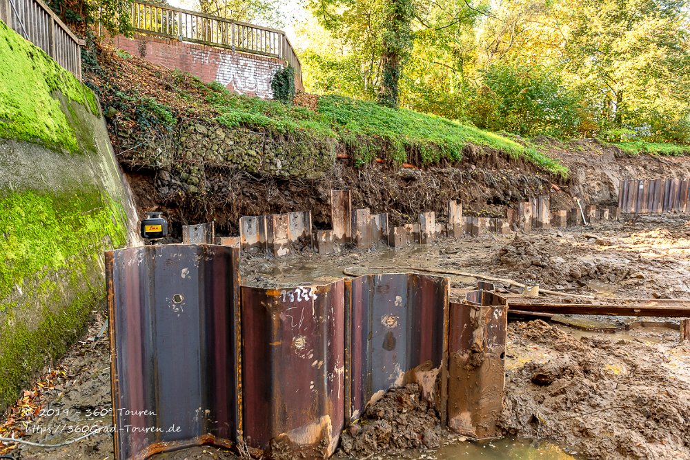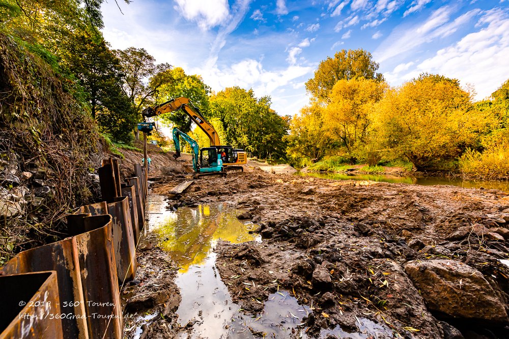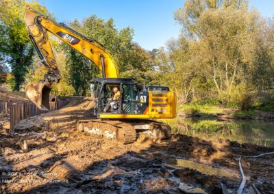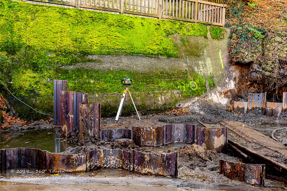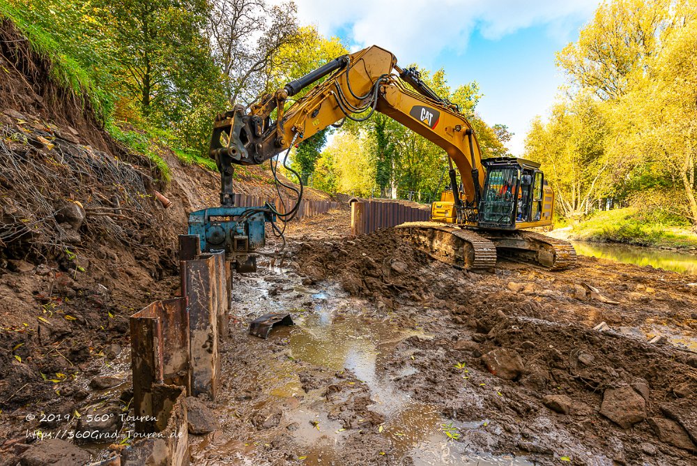Mittels Hydraulikramme wurden die Spundbohlen entlang der Böschung eingebracht. Anschließend erfolgte die exakte Anpassung der Spundbohlenhöhe mit Lasermessgeräten, um die Sandsteinblöcke der Fischaufstiegsanlage passgenau zu verlegen.