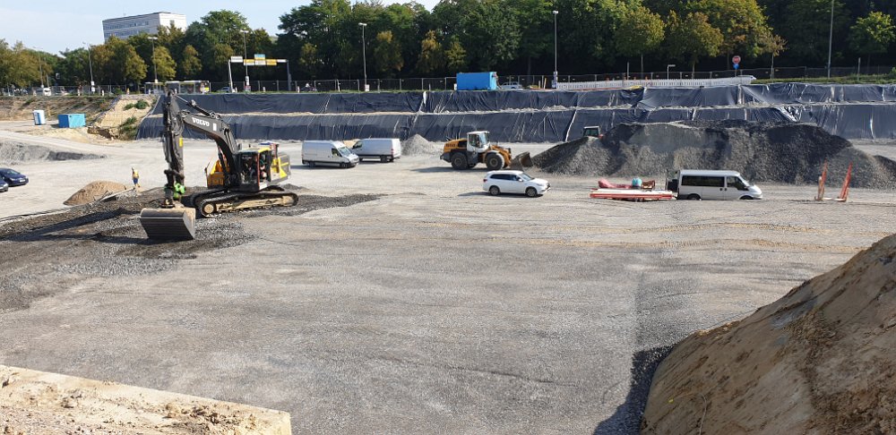 Die Baugrube erstreckt sich über eine Fläche von ca. 80 x 180 m und reicht bis zu 9 Meter unter Geländeniveau. Die Sicherung der Baugrube sowie eine umfassende Wasserhaltung waren aufgrund der Größe und Tiefe besonders anspruchsvoll.